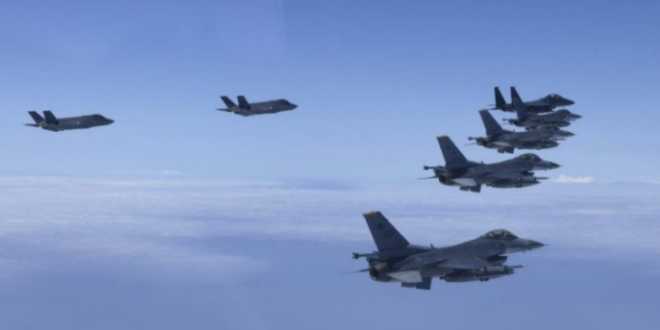 Dieciséis aviones de combate surcoreanos, incluyendo aviones furtivos F-35 y cuatro cazas F-16, formaron un escuadrón de ataque sobre el mar Amarillo para «responder a la amenaza enemiga,» declaró el jefe del Estado Mayor Conjunto de Corea del Sur.