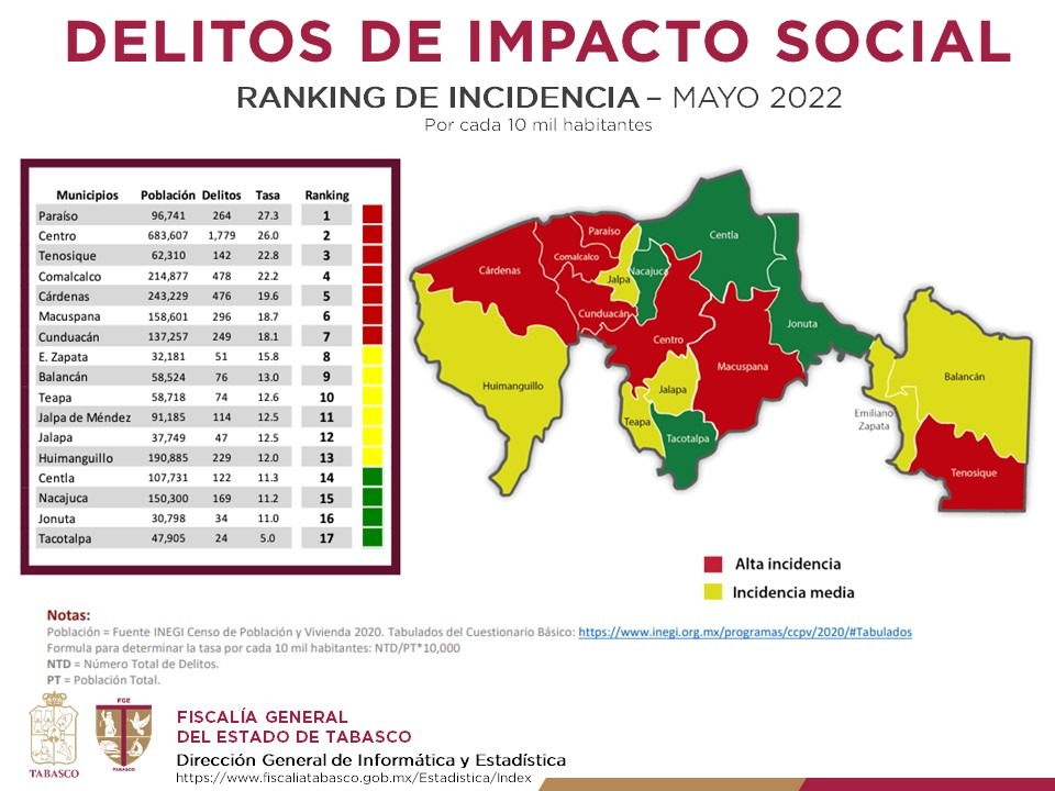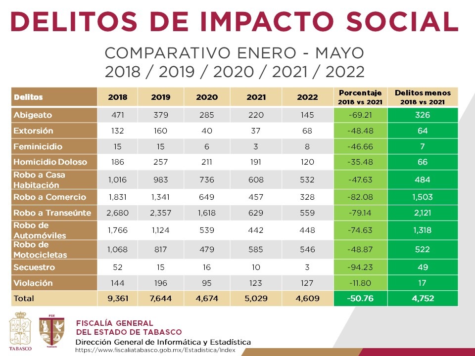 De enero a mayo de 2022, en Tabasco se cometieron 4 mil 752 menos delitos de impacto social que en el mismo periodo de 2018, lo que representa una reducción del 50.76 por ciento. Reafirmándose así, el compromiso de los tres órdenes de gobierno de atender la incidencia de conductas ilícitas hasta su mínima expresión y erradicación.