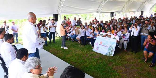 Desde esta tierra apartada y olvidada por los gobiernos neoliberales, el titular de Fonatur, Javier May, destacó que el 30 por ciento de los sembradores que conforman el esquema de producción son mujeres, lo que implica que sólo en Tabasco participan más de 60 mil mujeres que “reciben un jornal, reciben un pago, que sostienen y son el pilar de sus familias”.