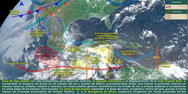 El Instituto de Protección Civil del Estado de Tabasco (IPCET), reporta que en el transcurso del día, la Onda Tropical número 4, podrá ingresar por la península de Yucatán y provocar lluvias muy fuertes en la región.