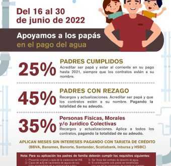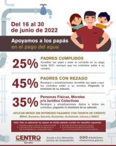 Además, un incentivo del 45 por ciento para contribuyentes con rezago, personas físicas que acrediten ser padres de familia en consumo de agua tipo doméstico, mismo que aplica en rezagos y actualizaciones, en todos sus contratos y pagando la totalidad de su adeudo.
