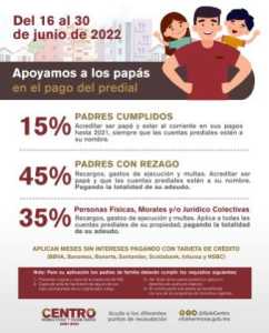 Villahermosa, Tabasco a 14 de junio de 2022.- El gobierno municipal de Centro invita a la población para que aprovechen el Programa de Incentivos Fiscales para el pago del Impuesto Predial y los Derechos por Consumo de Agua, en conmemoración del Día del Padre, que van del 15 al 45 por ciento y que estarán vigentes del 16 al 30 de junio del presente año.