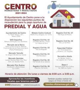 Para aproximar el servicio y atención a la población, el Programa de Incentivos Fiscales para el pago del Impuesto Predial y los Derechos por Consumo de Agua, cuenta con 17 puntos de atención que el gobierno de Centro tiene disponibles en el municipio, de lunes a viernes a partir de las 08:00 horas hasta las 15:00 horas.