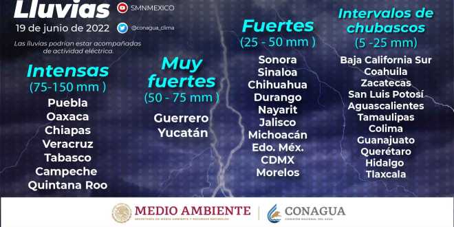 Las lluvias podrían ser con descargas eléctricas y caída de granizo en el noroeste, occidente y centro del país, incluido el Valle de México, además de ocasionar incremento en niveles de ríos y arroyos, deslaves e inundaciones en zonas bajas. Se pronostican vientos con rachas de 60 a 70 kilómetros por hora (km/h) y tolvaneras en Coahuila, San Luis Potosí, Sonora y Zacatecas, y rachas de 50 a 60 km/h en Aguascalientes, Baja California, Chihuahua, Durango, Guanajuato, Jalisco, Nuevo León y Tamaulipas, así como oleaje de 1 a 3 metros (m) de altura en la costa occidental de Baja California, Baja California Sur, el litoral de Quintana Roo, Yucatán y el Golfo de Tehuantepec.