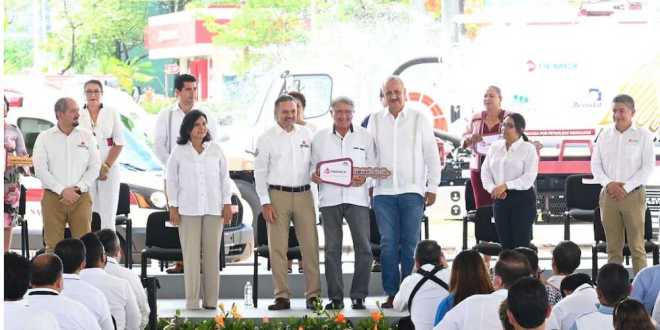 Romero Oropeza en el marco de la entrega de 23 equipos (ambulancias, patrullas, camiones vactor y recolectores de basura) al gobierno del estado y ocho municipios con una inversión cercana a los 100 millones de pesos.