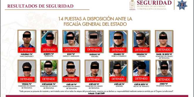 Ante la Fiscalía General del Estado (FGE), fueron puestos a disposición 14 personas como presuntos responsables de narcomenudeo, pederastia, daños y amenazas, lesiones, robo a comercio, homicidio en grado de tentativa, hechos de tránsito y violencia familiar.