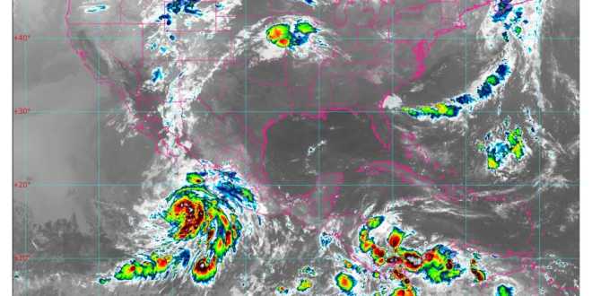 Asimismo, se prevé viento con rachas de 60 a 70 kilómetros por hora (km/h) y oleaje de 2 a 3 metros (m) de altura en costas de Colima y Jalisco; viento con rachas de 50 a 60 km/h y oleaje de 1 a 2 m en costas de Baja California Sur y Michoacán.