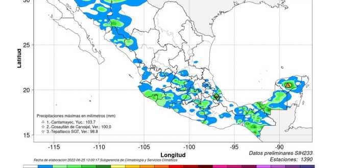 Para hoy se pronostican lluvias puntuales fuertes (de 25 a 50 milímetros [mm]) en Baja California Sur, Chiapas, Chihuahua, Ciudad de México, Colima, Durango, Estado de México, Guanajuato, Guerrero, Hidalgo, Jalisco, Michoacán, Morelos, Nayarit, Oaxaca, Puebla, Querétaro, Sinaloa, Sonora y Tlaxcala; intervalos de chubascos (de 5 a 25 mm) en sitios de Aguascalientes, Baja California, Campeche, Quintana Roo, Tabasco, Tamaulipas, Veracruz y Zacatecas, así como lluvias aisladas (de 0.1 a 5 mm) en zonas de Nuevo León, San Luis Potosí y Yucatán.