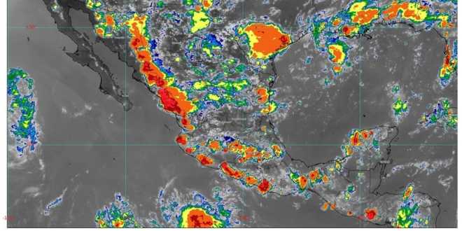 Para la noche de hoy, se pronostican lluvias muy fuertes (de 50 a 75 milímetros [mm]) en Chiapas, Colima, Durango, Guerrero, Estado de México, Jalisco, Michoacán, Morelos, Oaxaca y Sinaloa; fuertes (de 25 a 50 mm) en Campeche, Chihuahua, Ciudad de México, Coahuila, Nuevo León, Puebla, Sonora, Tamaulipas, Veracruz y Yucatán, y chubascos (de 5 a 25 mm) en Quintana Roo y Tabasco, mismas que pueden acompañarse de descargas eléctricas, además de condiciones para la caída de granizo en Campeche, Chiapas, Coahuila, Nuevo León, Oaxaca, Puebla, Tamaulipas, Veracruz y Yucatán.
