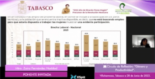 El Instituto Estatal de las Mujeres (IEM), abordó en su Círculo de Reflexión diario, el papel que juegan las mujeres en el ámbito laboral y ofreció la conferencia “Género y Productividad”, a cargo de la Doctora Zaira Fernández Haddad, Coordinadora de Políticas Públicas para la Productividad para la Hacienda Pública, de la Secretaría de Hacienda y Crédito Público (SHCP).
