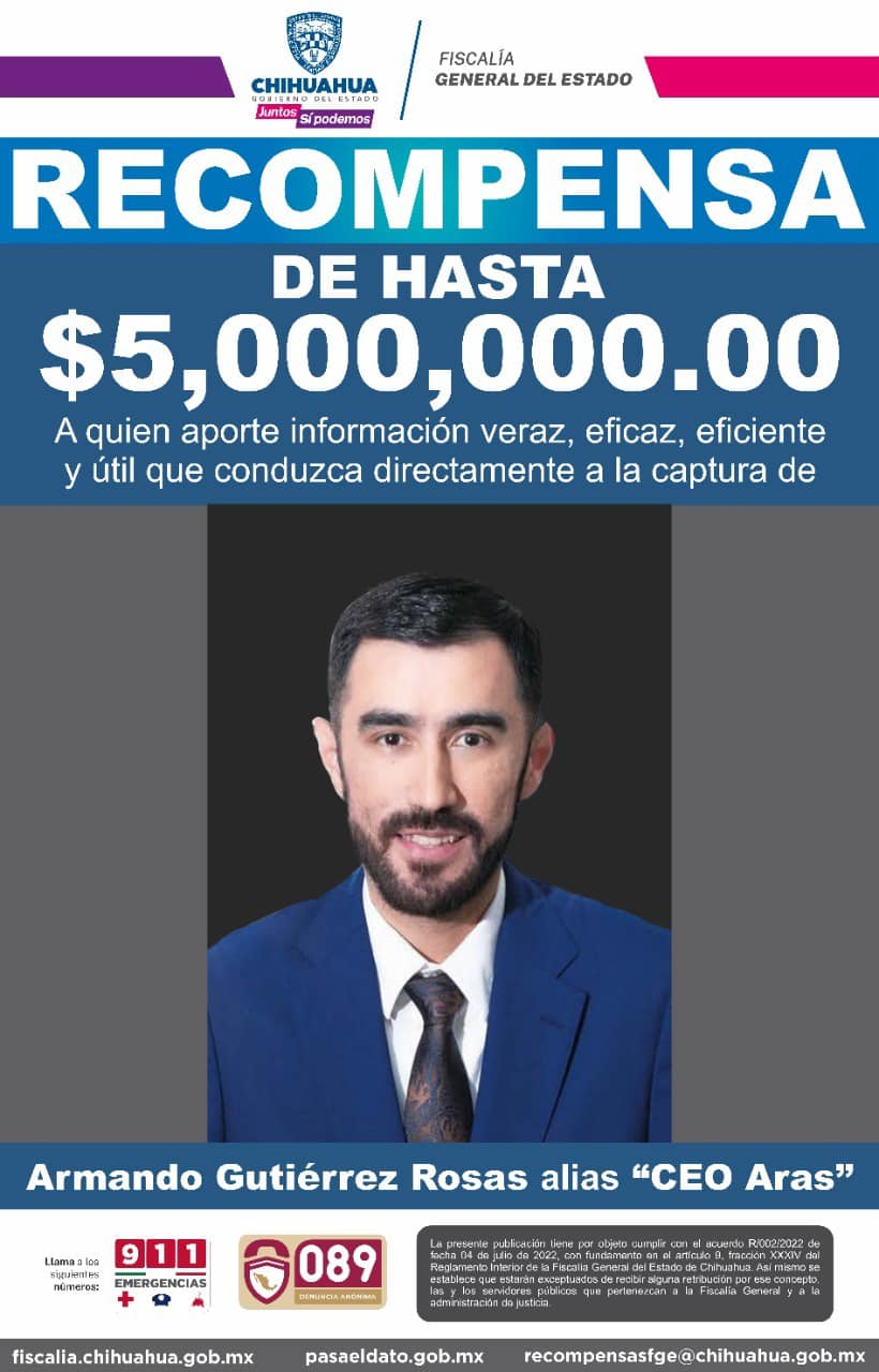 El fiscal General del estado de Chihuahua, Roberto Fierro, anunció en conferencia de prensa que se acordó ofrecer una recompensa de cinco millones de pesos (unos 250,000 dólares) a quienes aporten información que conduzca a la captura de Gutiérrez Rosas, “CEO Aras”, quien enfrenta cargos por fraude y asociación delictuosa desde noviembre pasado.
