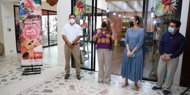 Ante la presencia de la gerente de alimentos y bebidas de este hotel Julie Castillo Zurita; el director de apoyo de comercialización del IFAT José de la Cruz Díaz Morales y el artesano Cesar Reynoso Reyes, la directora general del IFAT, Tisve Salazar Ramos, agradeció a la iniciativa privada y al sector hotelero tabasqueño por la apertura estos espacios que –dijo- permiten la exhibición y comercialización de las artesanías tabasqueñas.