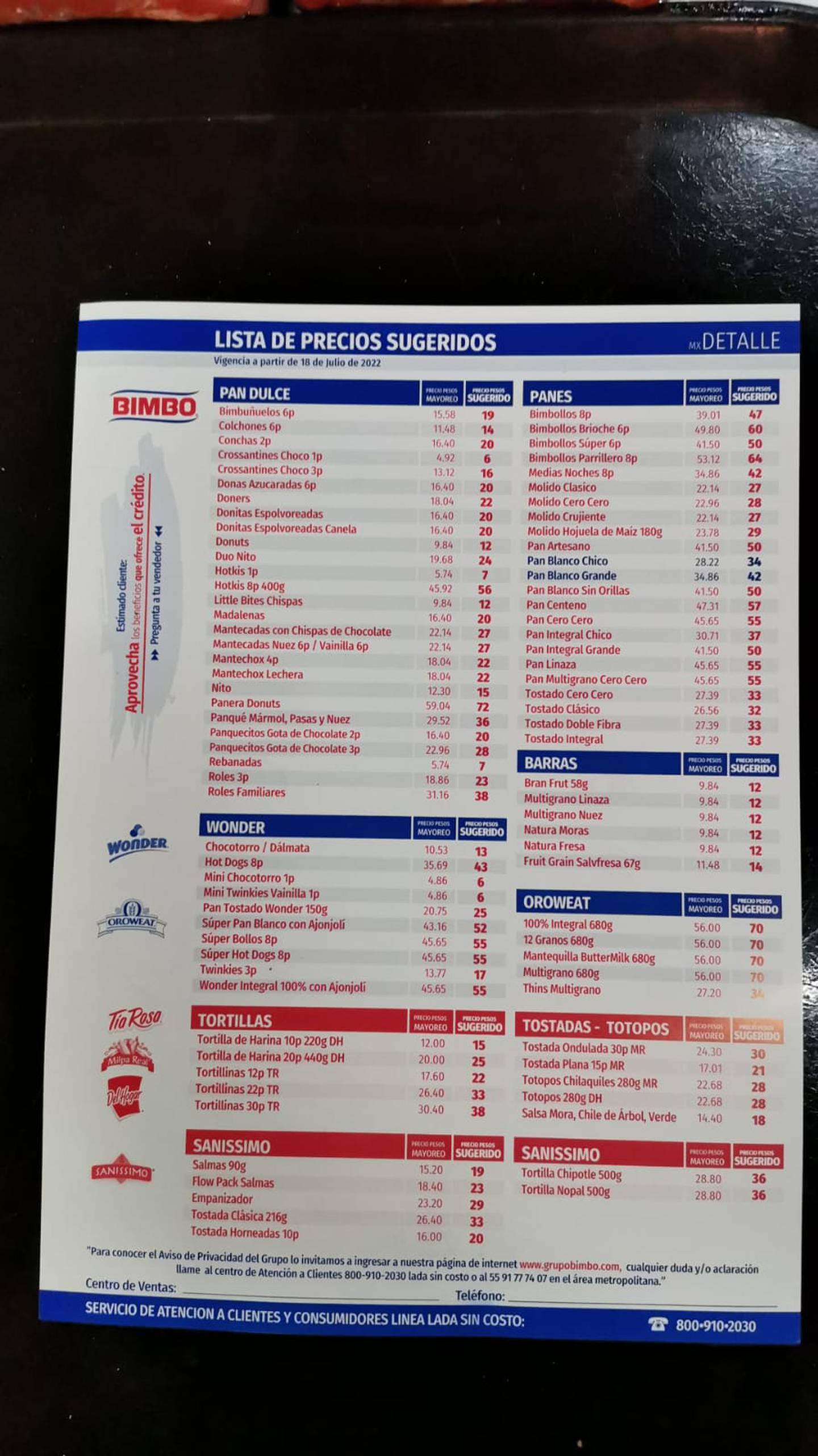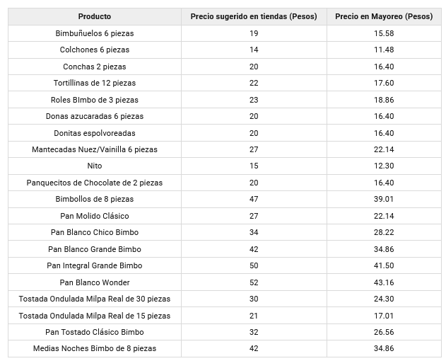 De acuerdo con la nueva tabla de precios sugeridos, esto valdrán los panes y productos de marcas como Bimbo, Wonder y Tía Rosa a partir del lunes 18 de julio.