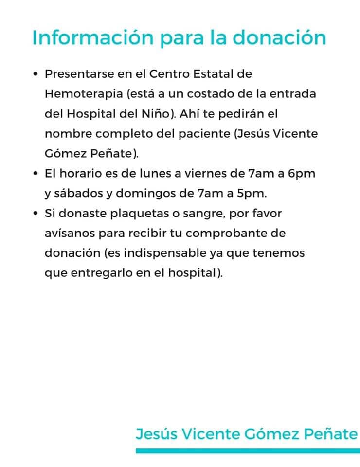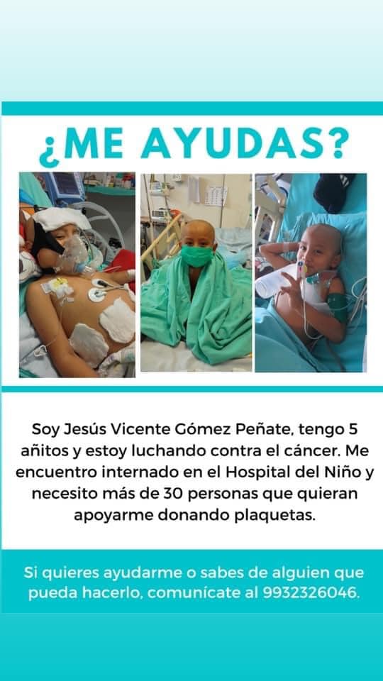 El pequeño Jesús Vicente Gómez Peñate necesita urgentemente donadores de plaquetas, por lo que sus padres han recurrido a las redes sociales para pedir el apoyo de la ciudadanía.
