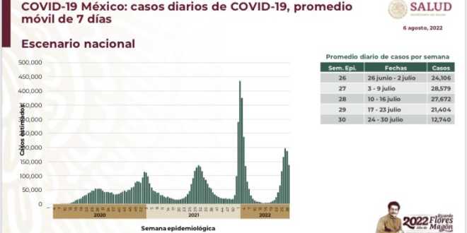 El Informe Técnico Diario COVID-19 de la Secretaría de Salud muestra que la semana epidemiológica 30, que abarca del 24 al 30 de julio, cierra con disminución de casos en promedio por día, con 12 mil 740, mientras que en la semana 29 hubo 21 mil 404.