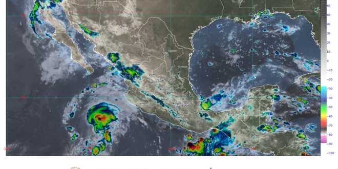 La madrugada de hoy, la Depresión Tropical Nueve-E se localizó aproximadamente a 590 kilómetros (km) al oeste-suroeste de Manzanillo, Colima, y a 740 km al sur de Cabo San Lucas, Baja California Sur, con vientos máximos sostenidos de 55 km/h, rachas de 75 km/h y desplazamiento hacia el oeste-noroeste a 24 km/h. Su amplia circulación ocasionará vientos fuertes y oleaje en las costas de Baja California Sur y Jalisco, y reforzará la probabilidad de lluvias fuertes en el occidente del país.