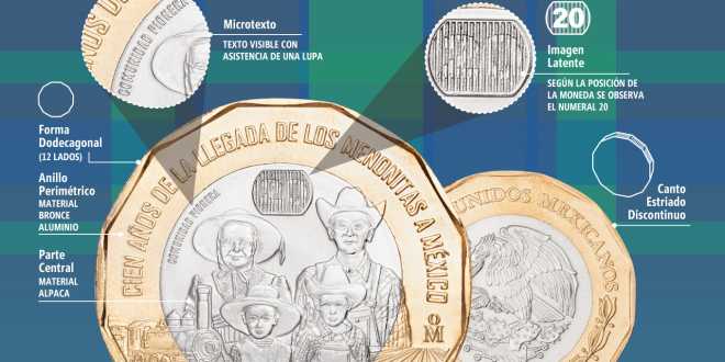 El Banco de México informa que el día de hoy puso en circulación una moneda de veinte pesos, conmemorativa de los cien años de la llegada de los Menonitas a México. Esta moneda es bimetálica, tiene forma dodecagonal, cuenta con una imagen latente y un micro texto como elementos de seguridad.