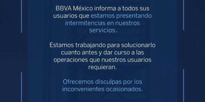En México, usuarios de BBVA reportaron en las diversas redes sociales fallas en la aplicación móvil, cajeros automáticos, así como tarjetas de la institución financiera; debido a intermitencias en los servicios de la institución financiera.