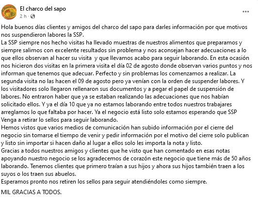 El establecimiento de alimentos, que lleva el nombre de El Charco del sapo, está siendo afectado por un cierre que fue realizado pese a que ya se encontraban dando solución a medidas solicitadas por la Secretaría de Salud de Tabasco, aseguran los propietarios.