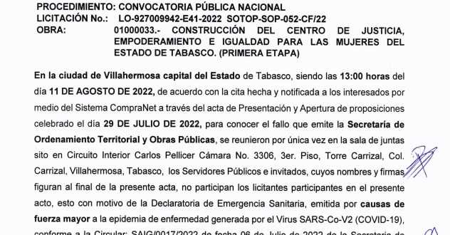 Según el portal de Compranet revisado por Novedades de Tabasco, de las cinco empresas participantes en la licitación, se definió aquella que cumple con las características necesarias y que deberá iniciar trabajos el 15 de agosto y tendrá una duración de 130 días naturales, con el compromiso de entregar la obra el 22 de diciembre de este año.