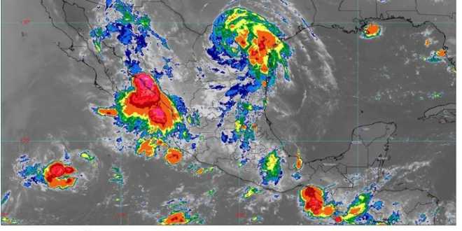 Para hoy, martes, se pronostican lluvias intensas (de 75 a 150 milímetros [mm]) en Coahuila, Colima, Jalisco, Guanajuato, Nuevo León, San Luis Potosí, Sinaloa, Sonora y Tamaulipas; muy fuertes (de 50 a 75 mm) en Chiapas, Chihuahua, Durango, Estado de México, Guerrero, Hidalgo, Michoacán, Nayarit, Oaxaca, Puebla, Querétaro, Veracruz y Zacatecas; fuertes (de 25 a 50 mm) en Aguascalientes, Baja California Sur, Campeche, Ciudad de México, Morelos, Tlaxcala y Yucatán, y chubascos (de 5 a 25 mm) en Baja California, Quintana Roo y Tabasco.