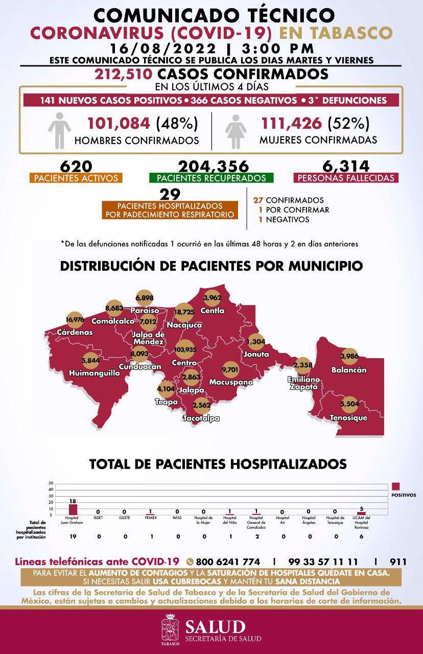 La Secretaría de Salud informó que en los últimos cuatro días se registraron 141 nuevos casos positivos por Covid-19 y tres defunciones, por lo que Tabasco llegó a 212 mil 510 casos confirmados y 6 mil 314 fallecidos, por la enfermedad respiratoria.