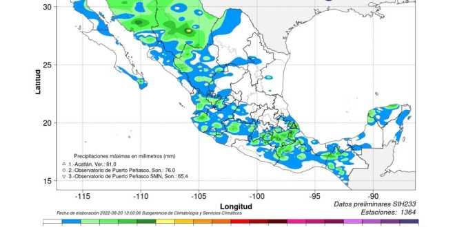 Para este sábado, se pronostican lluvias puntuales intensas (de 75 a 150 milímetros [mm]) en Chihuahua, Oaxaca, Puebla, San Luis Potosí, Sonora, Tamaulipas y Veracruz, muy fuertes (de 50 a 75 mm) en sitios de Ciudad de México, Colima, Estado de México, Guanajuato, Guerrero, Hidalgo, Jalisco, Michoacán, Morelos, Nayarit, Sinaloa y Tlaxcala, fuertes (de 25 a 50 mm) en Chiapas, Durango, Nuevo León y Querétaro, así como intervalos de chubascos (de 5 a 25 mm) en Aguascalientes, Baja California, Baja California Sur, Campeche, Coahuila, Quintana Roo, Tabasco, Yucatán y Zacatecas.