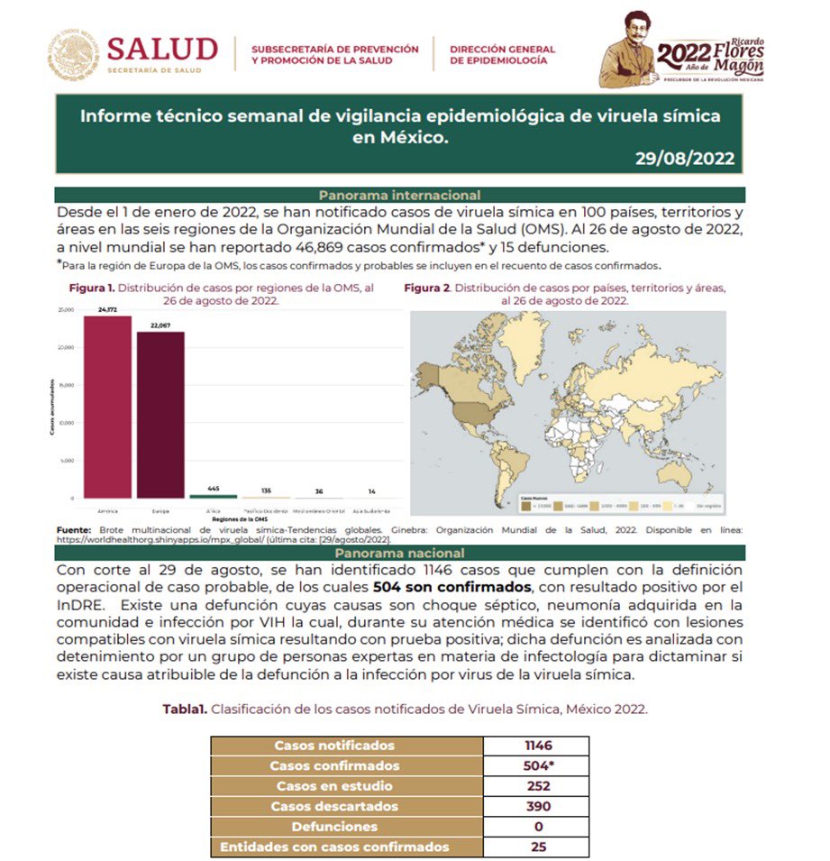El documento disponible en viruela.salud.gob.mx detalla que en el periodo referido se identificaron en total mil 146 personas que cumplen la definición operacional de caso probable, de los cuales 504 están confirmados, 252 en estudio y 390 descartados mediante prueba de laboratorio.