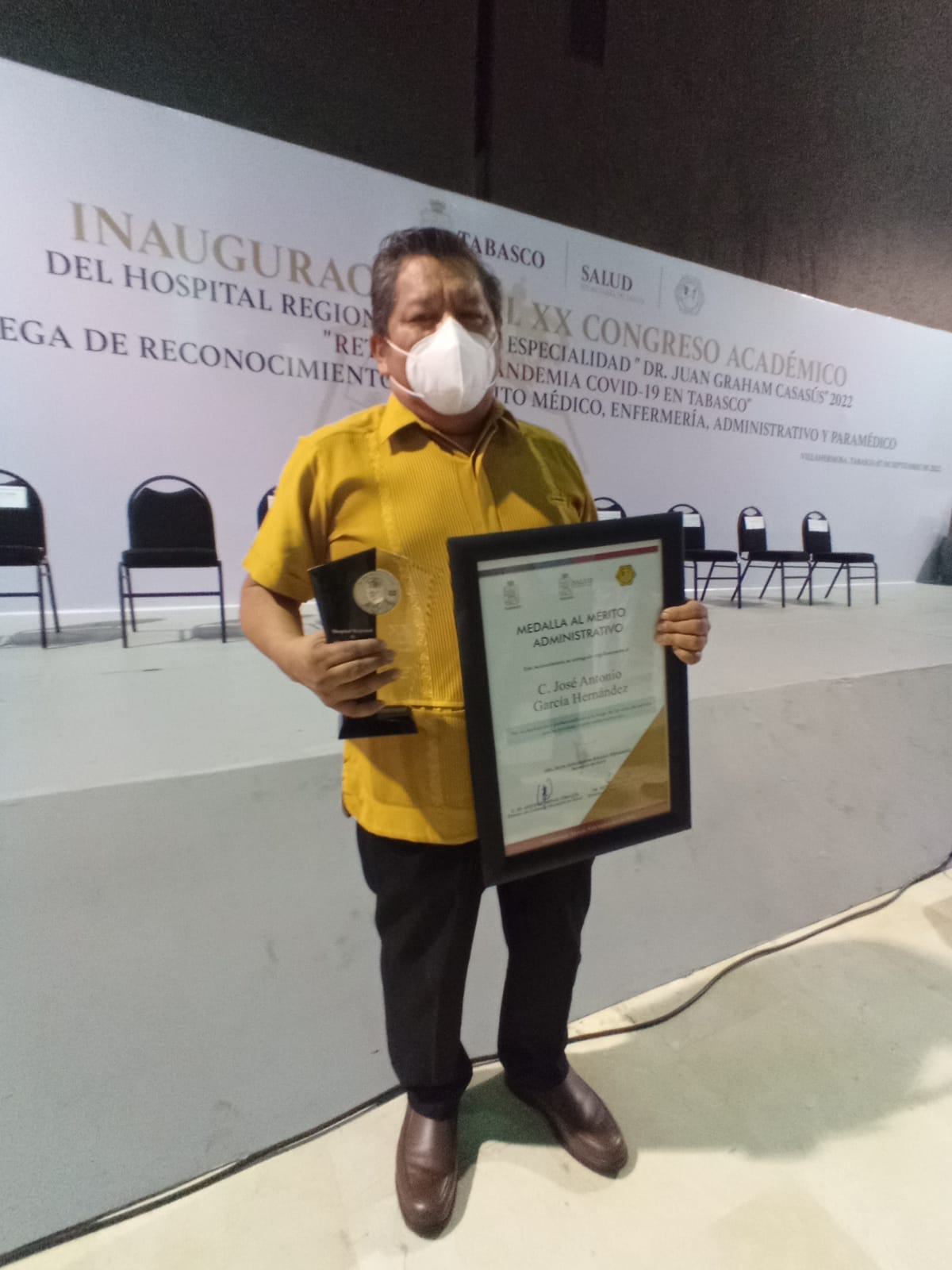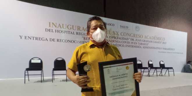 En el marco del XX Congreso Académico del Hospital de Alta Especialidad, Dr., Juan Graham Casasús, le fue entregada la Medalla al Merito Administrativo al C. José Antonio García Hernández por su ardua labor de 40 años de servicio, donde autoridades de la Secretaría de Salud felicitaron y reconocieron la labor de este funcionario público.