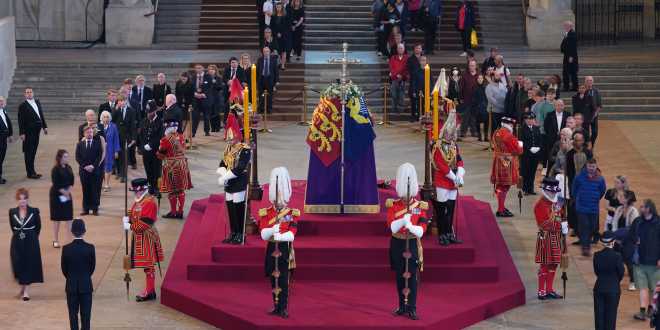 El féretro de Isabel II está ya en el palacio de Westminster. Poco después de las cinco de la tarde, hora local (una hora más en la España peninsular), la ciudadanía ha comenzado a despedirse de la reina en la capilla ardiente. Se espera que la fila de personas que quieren dar el último adiós a la monarca llegue a alcanzar casi ocho kilómetros, más allá de la Torre de Londres. La previsión es que la capilla ardiente sea visitada por cientos de miles de personas desde hoy hasta el próximo lunes, cuando tendrá lugar el funeral de Estado por Isabel II. El cortejo fúnebre ha recorrido las calles de Londres desde Buckingham hasta la sede del Parlamento, encabezado por el rey Carlos III, sus tres hermanos —Ana, Andrés y Eduardo— y sus hijos, los príncipes Guillermo y Enrique. El ataúd ha sido trasladado en un armón de artillería tirado por seis caballos. Los londinenses han aplaudido a su reina al paso de la comitiva.