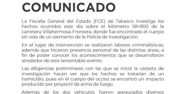 La Fiscalía General del Estado (FGE) de Tabasco investiga los hechos ocurridos este día sobre el kilómetro 58+800 de la carretera Villahermosa-Frontera, donde fue encontrado el cuerpo sin vida de un elemento de la Policía de Investigación.