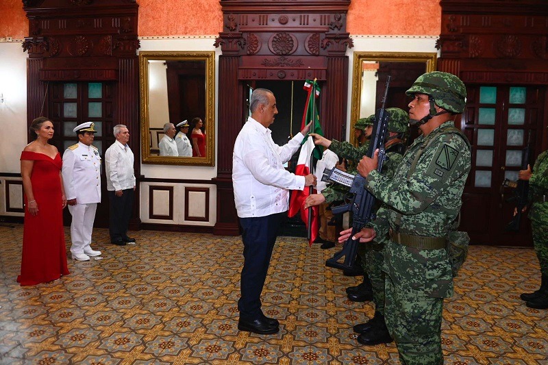 Pasadas las once de la noche, acompañado de la presidenta del DIF estatal, Guadalupe Castro de Merino, el gobernador recibió de una escolta del 37 Batallón de Infantería el lábaro patrio con el que, tras escuchar la lectura del Acta de Independencia a cargo del secretario del Ayuntamiento de Centro, José Antonio Alejo Hernández, salió al balcón la sede del Poder Ejecutivo.