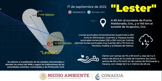 La tormenta tropical ‘Lester’ mantendrá su desplazamiento hacia las costas de Guerrero en las próximas horas, sus bandas nubosas ocasionarán lluvias torrenciales en Guerrero y Oaxaca, e intensas en Puebla, así lo señaló la Comisión Nacional del Agua (Conagua).