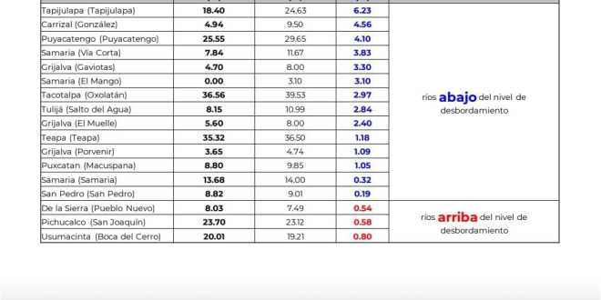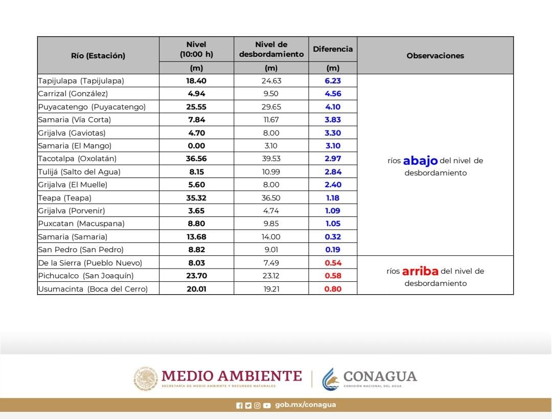 La Conagua informa la situación de los ríos en Tabasco, con corte a las 10:00 horas. El río Pichucalco, se encuentra 0.58 m arriba de su nivel de desbordamiento. Hasta el momento, está desbordando hacia zonas de regulación, no afecta población.