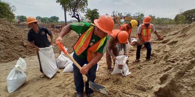 Al menos 30 trabajadores se encuentran rellenando 3 mil costales con arena para colocarlos en el Malecón Carlos A. Madrazo, como medida preventiva ante el incremento del río Grijalva.