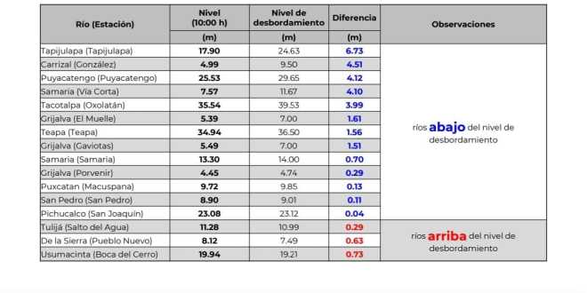 El Instituto de Protección Civil del Estado de Tabasco (IPCET) alertó que cinco ríos ya superaron sus márgenes de afectación, por lo que pidió a la población que vive cerca de los afluentes De la Sierra, Pichucalco, Grijalva (Gaviotas), Tulijá y Usumacinta, extremas precauciones ante la posibilidad de que sigan creciendo.