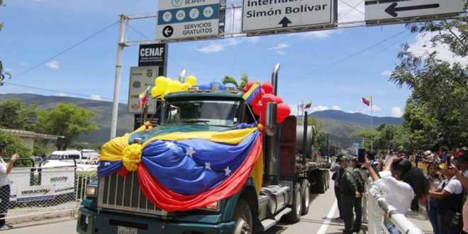 Minutos después, un camión colombiano,también adornado con su bandera y cargado con medicamentos pasó el puente en dirección a Venezuela.