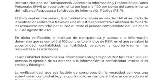 El Instituto Nacional de Migración (INM) de la Secretaría de Gobernación obtuvo del Instituto Nacional de Transparencia, Acceso a la Información y Protección de Datos Personales (INAI) un reconocimiento por lograr el 100 por ciento del cumplimiento del Índice de Respuesta a Solicitudes de Información Pública (RSIP).