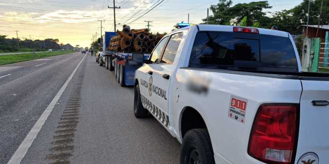 En Tabasco, Guardia Nacional asegura tractocamión cargado con tubería metálica de Pemex de aparente procedencia ilícita
