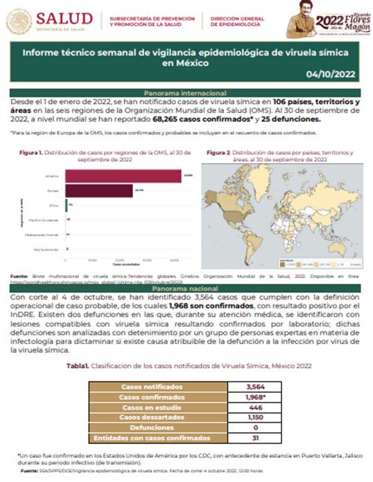 El documento, disponible en viruela.salud.gob.mx/, detalla que en el periodo referido se identificaron en total tres mil 564 personas que cumplen la definición operacional de caso probable, de los cuales mil 968 están confirmados, 446 en estudio y mil 150 descartados mediante prueba de laboratorio.