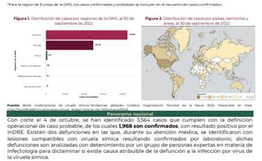 Hasta el 3 de octubre se han confirmado mil 968 contagios de viruela símica en 31 entidades federativas y ninguna defunción, refiere el Informe Técnico Semanal de Vigilancia Epidemiológica de la Secretaría de Salud.
