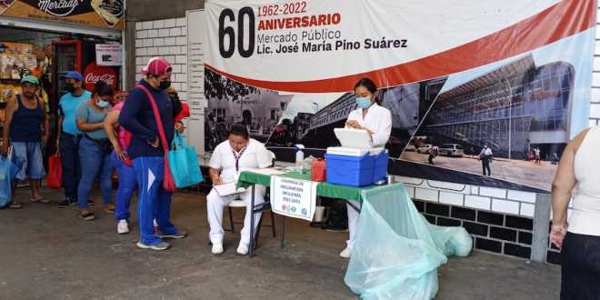 “Alrededor de 400 vacunas colocamos al día y estaremos hasta el sábado aquí en el mercado, y después en nuestras clínicas familiares seguiremos aplicando la vacuna contra la influenza”, señaló.