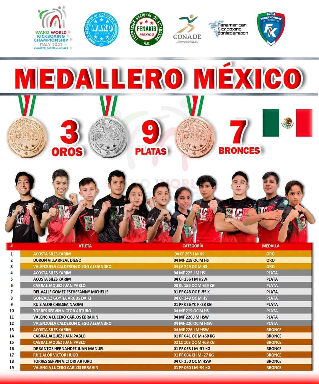 Fueron los atletas Estefany Michelle del Valle Gómez, Chelsea Naomi Ruiz Alor y Víctor Hugo Ruiz Alor, quienes se agenciaron estas preseas de plata y bronce durante sus encuentros, sumando al medallero general de México.