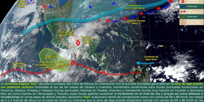 Durante la tarde de hoy, se formó la tormenta tropical Karl, que se dirige hacia Veracruz, provocando un temporal de lluvias en Veracruz, Puebla, Tabasco, Chiapas y Oaxaca. Por ello, el Gobierno de México reiteró el exhorto a autoridades estatales y municipales, así como a la población, para que extremen medidas de protección, con el fin de prevenir afectaciones a la vida de las personas.