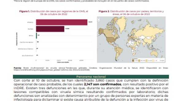 El documento disponible en viruela.salud.gob.mx detalla que en el periodo referido se identificaron en total tres mil 860 personas que cumplen la definición operacional de caso probable, de los cuales dos mil 147 están confirmados, 504 en estudio y mil 209 descartados mediante prueba de laboratorio.