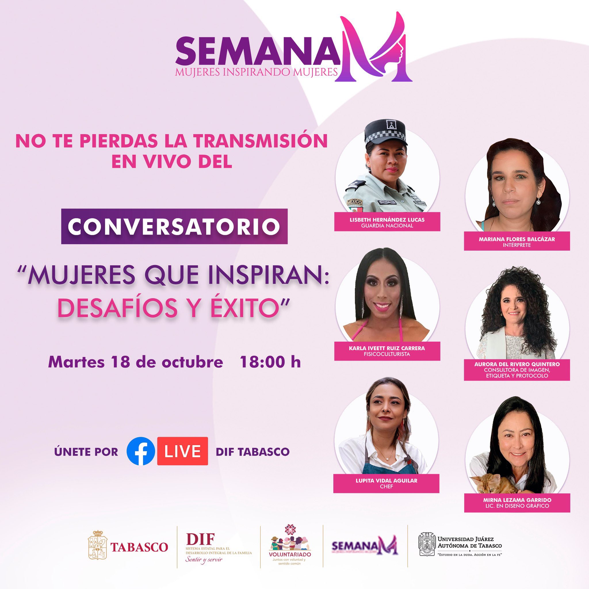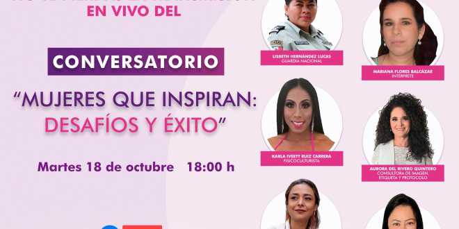 En este conversatorio participarán Lisbeth Hernández Lucas, quien es miembro de la Guardia Nacional; Lupita Vidal, chef tabasqueña; Mariana Flores Balcázar, intérprete; Karla Ivett Ruiz Carrera, fisicoculturista; Aurora del Rivero Quintero, consultora de imagen y Mirna Lezama Garrido, diseñadora gráfica, mujeres que han tenido éxito en diversos rubros.