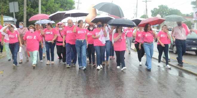 Pese a la lluvia, un gran contingente de personas, en su mayoría mujeres, recorrieron, ataviadas con su playera rosa y pancartas alusivas al tema, unos dos kilómetros, saliendo de una plaza comercial, hasta el estacionamiento del Juan Graham, en este evento, organizado por la presidenta del voluntariado de este nosocomio, Patricia Morales de Narváez.
