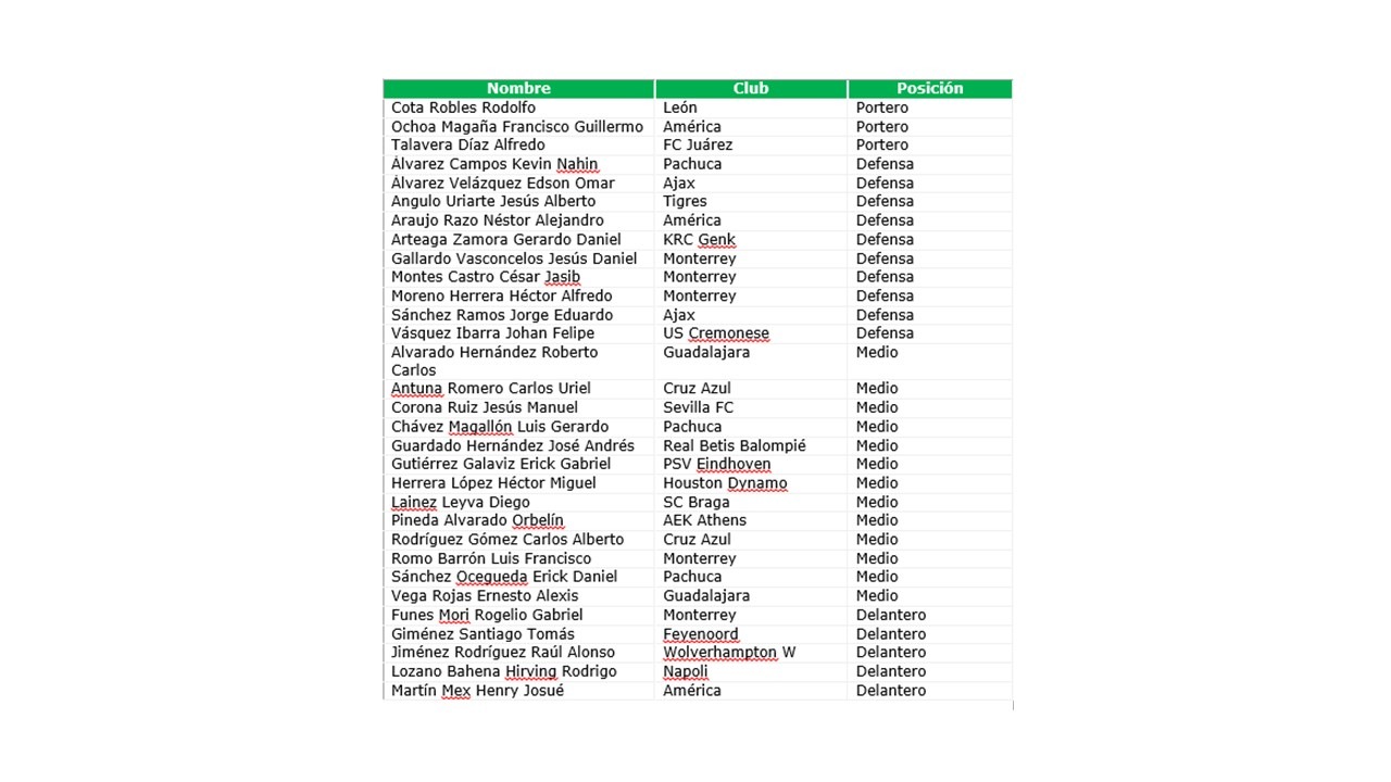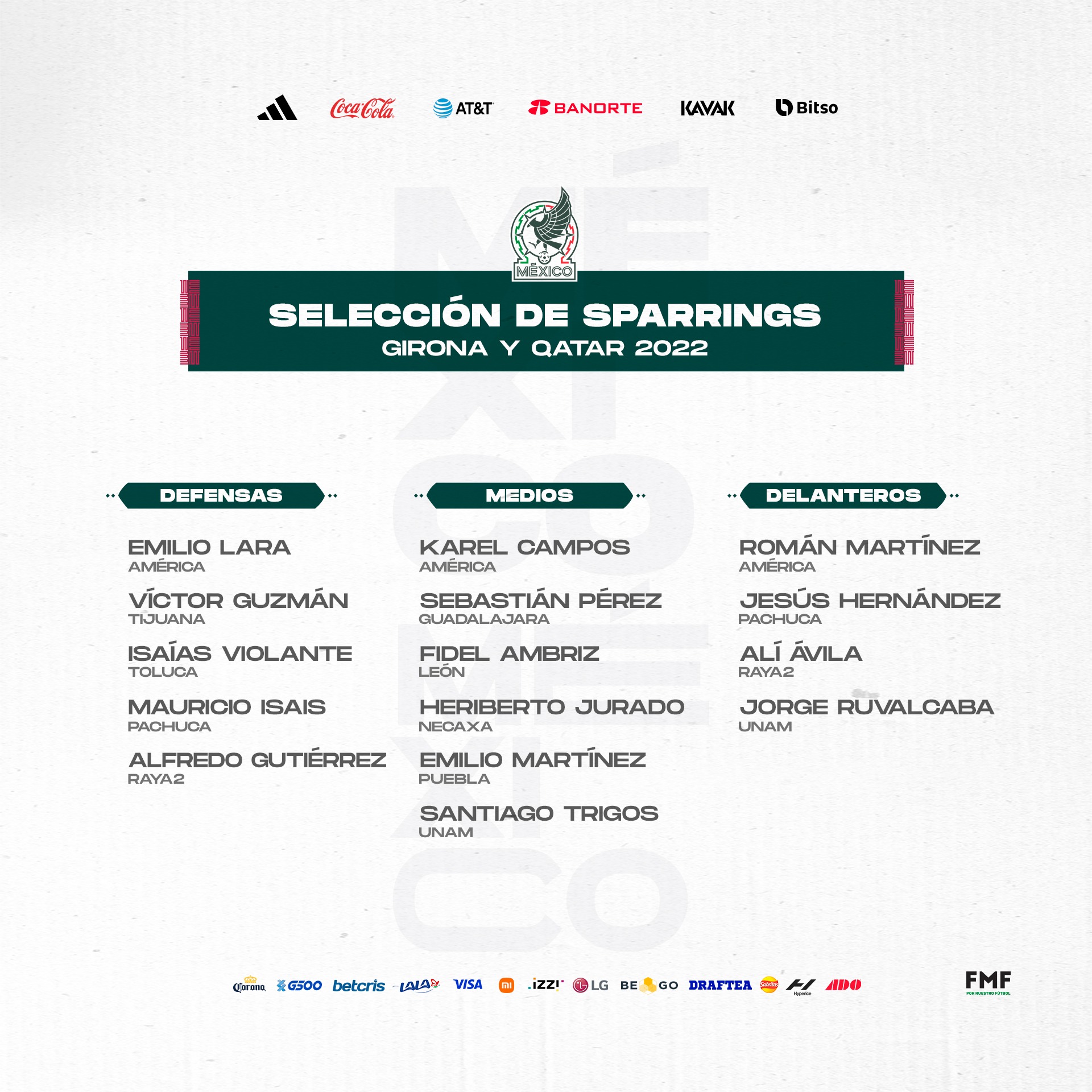 Así mismo, la Dirección de Selecciones Nacionales Varoniles da a conocer la lista de jugadores sparrings convocados por Gerardo Martino, director técnico de la Selección Nacional de México, para la gira por Girona y la Copa del Mundo Qatar 2022.