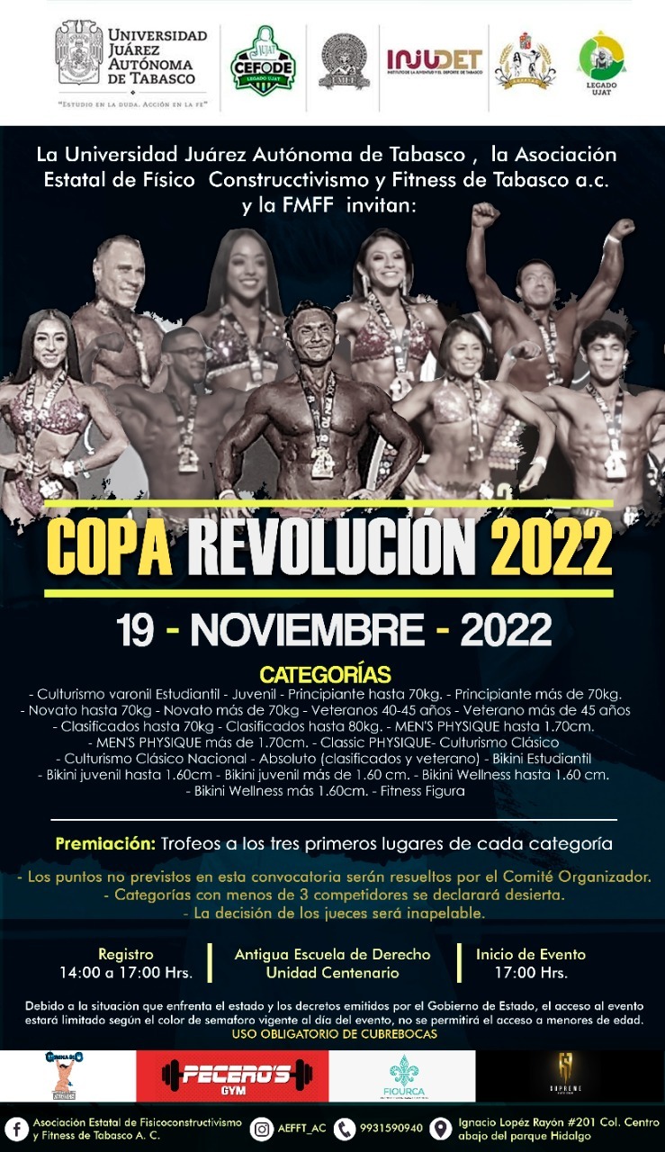 La Asociación Estatal de Físicoconstructivismo y Fitness de Tabasco (AEFFT) lanzó la convocatoria oficial para la Copa Revolución 2022.