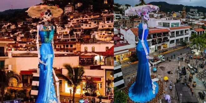 En Puerto Vallarta, Jalisco, ensamblaron una estructura en forma de Catrina de 23 metros de altura con la que se busca batir el récord Guinness de la catrina más alta del mundo.